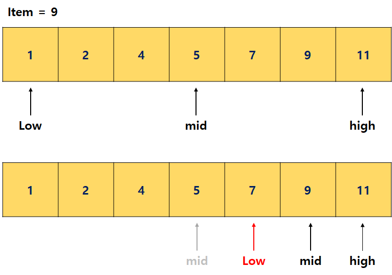 이 중간 값과 item 값을 비교하여 'item > 중간값'인 경우 low의 위치를 중간 값 인덱스보다 한 칸 뒤에 위치하도록 합니다. 반대로 'item < 중간값'인 경우 high의 위치를 중간 값 인덱스보다 한 칸 앞에 위치하도록 합니다.