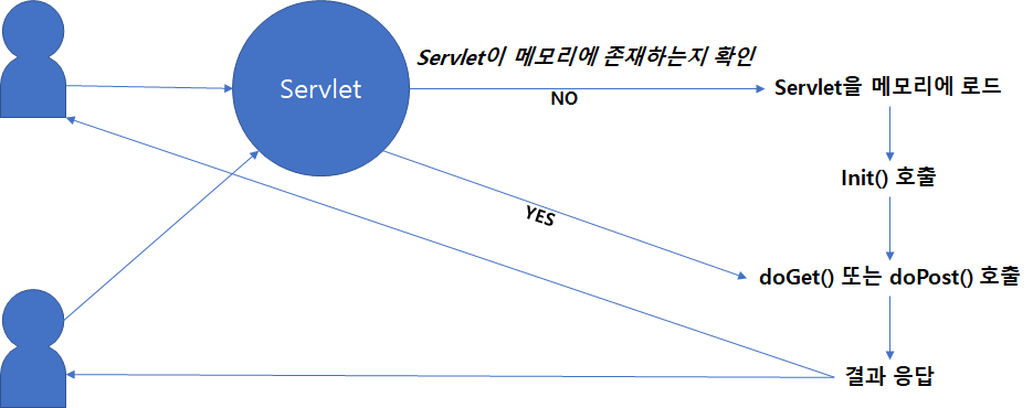 | 객체 생성 | Servlet이 최초로 요청된 경우 Servlet클래스를 메모리에 로딩하여 객체 생성. 생성된 객체는 메모리에 계속 존재하므로 이후 Servlet 요청 시 새로운 객체를 생성하지 않고 메모리에 로드된 Servlet 객체를 사용한다. | |