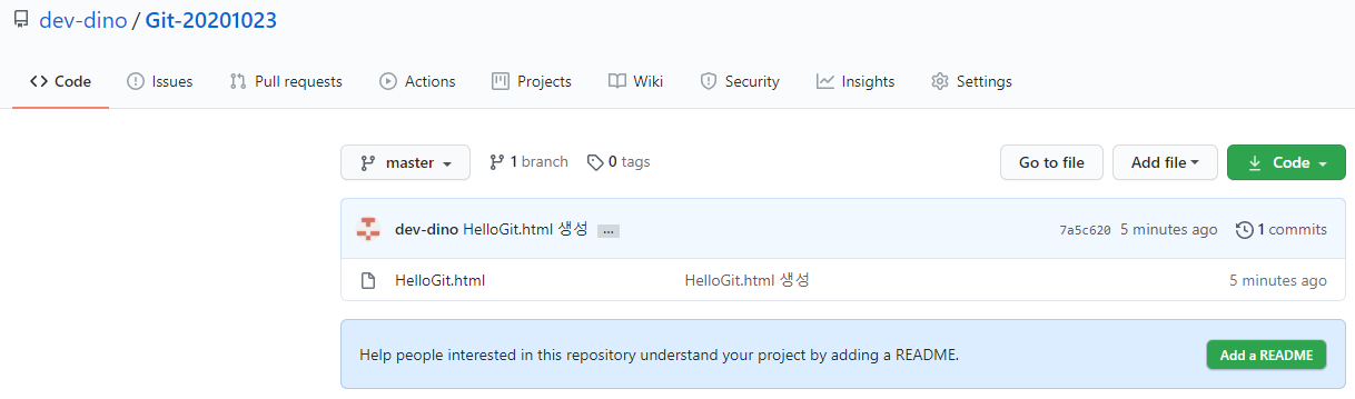 Repository에 'HelloGit.html' 파일을 생성했습니다.